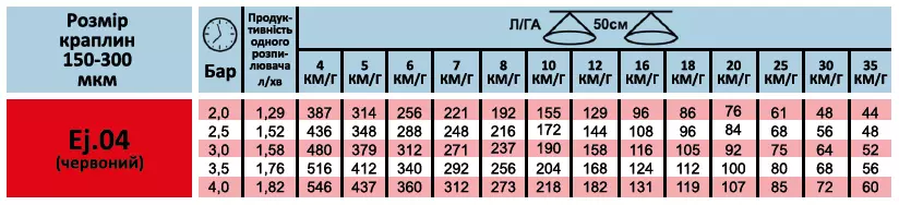 Можливість працювати нормою виливу від 150 до 250 л/га при робочому тиску від 2-х до 4-х атм. і швидкості руху 8-10 км/г за рахунок дрібної краплі і покриття більше 80% загальної площі рослини. Для роботи на більш високих швидкостях дивіться норми виливу в таблиці.