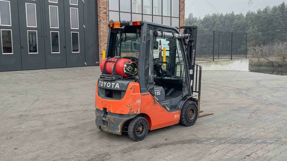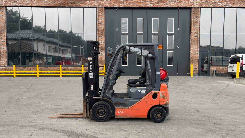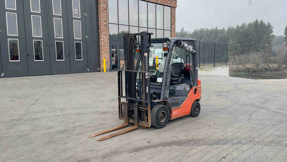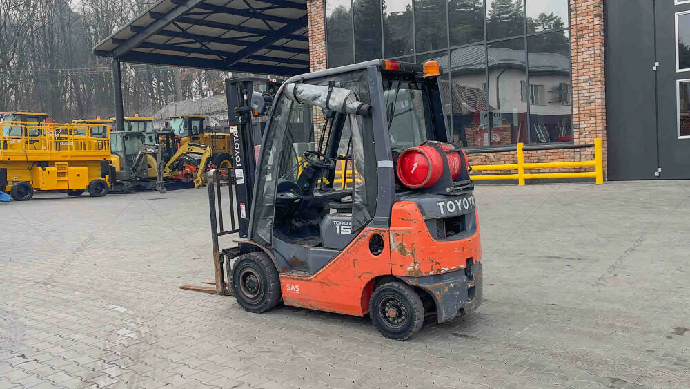 Газовий навантажувач б/в Toyota 02-8FGF15, 2018 р/в. З напрацюванням 5624 м/г. Тип щогли Standart. Вантажопідйомність 1500 кг. Висота підйому 3,3 м. Загальна висота навантажувача 2,11 м. Шини П.6,50-10. З.5.00-8.