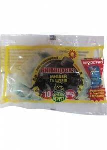 ВИНИЩУВАЧ МИШЕЙ ТА ЩУРІВ 100 г препарату містить діючу речовину (г): бродіфакум 0,005; Фармакологічні властивості Бродіфакум – отрута антикоагулянтної дії, яка при потраплянні в організм гризунів порушує утворення вітаміну К1, в присутності якого виробляються білки протромбінового комплексу. Через добу після вживання летальної дози бродіфакуму рівень згортання крові у гризунів різко сповільнюється і підвищення проникливості судин тварини викликає загибель організму від кровотечі. Загибель гризунів наступає через (3-7) діб. Застосування Препарат застосовують для знищення мишей та щурів на фермах, у тваринницьких приміщеннях (свинарниках, корівниках, телятниках, пташниках, кошарах, конюшнях) за умови недопущення доступу тварин до розкладених приманок. У свинарниках - при утриманні свиней в закритих станках; у корівниках - при утриманні корів на прив’язі; у телятниках - при утриманні молодняку у клітках або на прив’язі; у пташниках - при утриманні птиці у клітках; у кошарах - при утриманні овець у клітках; у конюшнях - при утриманні коней у денниках. Препарат використовують у приміщеннях організацій і установ сільськогосподарського призначення, а також складах, бойнях, молокопунктах. Гризуни поїдають приманку і гинуть протягом (3-7) діб, не викликаючи підозри у інших особин. Дозування Фільтр-пакетики з препаратом (не розкриваючи) розкладають за допомогою пінцету, гумових рукавичок або пластикової ложки (щоб уникнути доторкання до фільтр-пакетиків руками, тому, що запах людини відлякує гризунів) в укриттях, у спеціальних або пристосованих для цього шматках картону, поліетилену з розрахунку по 1 пакетику для кожної миші, (2-3) пакетики для кожного щура в місцях появи гризунів, поблизу нір, на шляху їх пересування, вздовж стін. Розкладають фільтр-пакетики з препаратом через (2-10) м в залежності від виду та чисельності гризунів. При великій чисельності гризунів необхідно своєчасно додавати препарат, не допускаючи його повного поїдання. Припиняють розкладати фільтр-пакетики з препаратом, тоді, коли вони залишаються на місці розкладання не пошкодженими, тобто гризуни їх не поїдали. Загибель гризунів починається через (3-4) доби. Кінцевий ефект вираховують через 3-4 тижні. Протипоказання Забороняється використання препарату в місцях зберігання кормів для тварин та продуктів харчування. Протипоказано застосовувати в приміщеннях та на територіях, де може бути вільний доступ тварин чи птиці до препарату. Застереження При проведенні планової дератизації на території ферми не допускати присутності домашніх тварин, сторонніх осіб, особливо дітей. Розкладати препарат мають право фахівці ветеринарної медицини або інші особи, які пройшли інструктаж по роботі з даним отрутохімікатом під наглядом фахівця ветеринарної медицини. Всі роботи з препаратом проводити у спецодязі, розкладати пакетики із засобом за допомогою гумових рукавичок, пінцетів, пластикових ложок. У випадку забруднення шкіри препаратом, старанно промити це місце водою з милом. Під час роботи з препаратом не їсти, не пити, не палити, при потраплянні препарату в шлунок слід звернутися до лікаря. Залишки не з’їденого препарату, тару, трупи гризунів спалюють. Аналог: Крисина смерть. Винищувач на відміну від Крисиної смерті має два запахи які приманюють гризунів - жарену олію та ар
