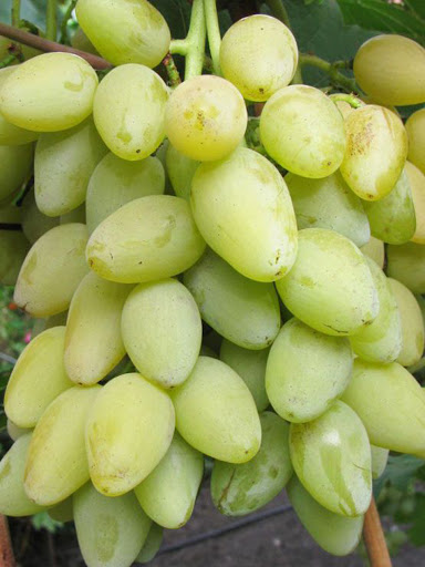 Столовий виноград раннього терміну дозрівання. Грони 600-1300 гр. Ягоди овальні із звуженим кінчиком, жовто-солом'яного