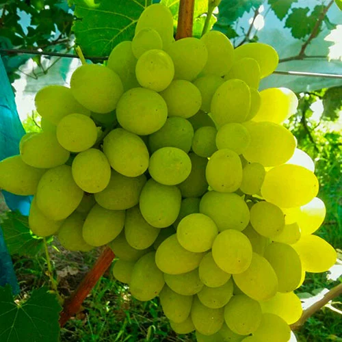 Грона великі 600-800 г, циліндричні, помірно щільні і щільні. Ягоди великі 27x24 мм, овально-конічні, білого кольору, м'якоть і шкірка щільні, гармонійного смаку, з високим рівнем цукру.