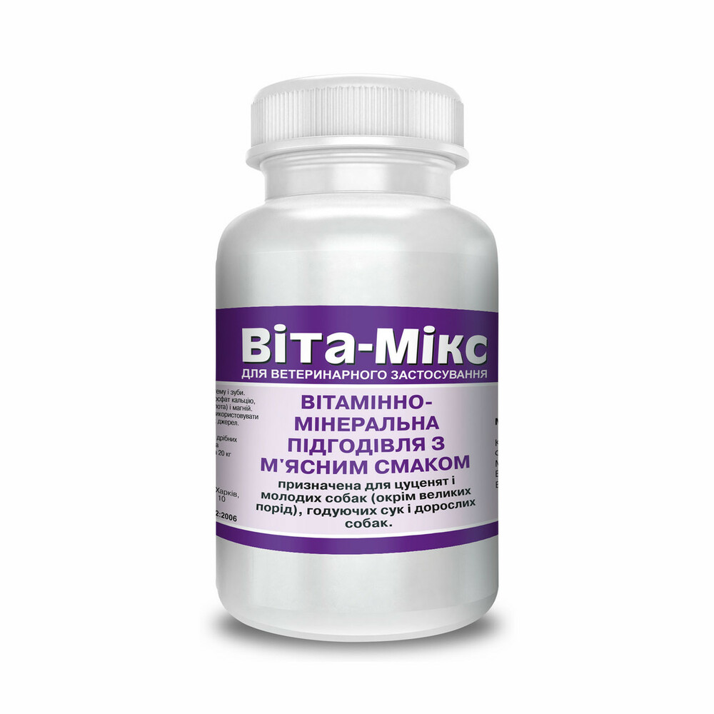 Вітамінно-мінеральна підгодівля з м'ясним смаком «Віта-Мікс» (фіолетовий) рекомендована для щоденного доповнення кормового раціону собак вітамінами і мінералами.