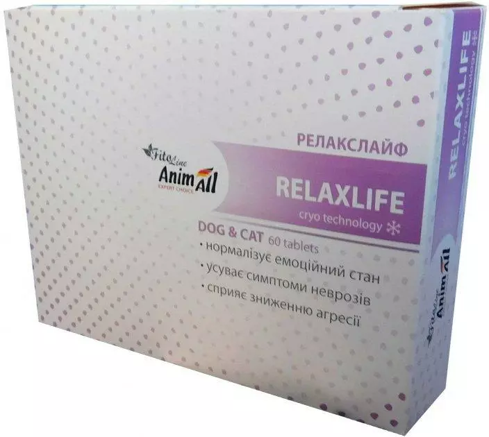 Релакслайф надає заспокійливу дію, усуває дратівливість, нормалізує емоційний стан тварин, знижує почуття тривоги та страху, сприяє зниженню агресії, зумовленої нервовими розладами, виявляє седативну дію на кішок і собак у період тічки. Компоненти препарату нормалізують кров'яний тиск, сприятливо впливають на стан кровоносних судин і в такий спосіб здійснюють профілактику порушень із боку серцево-судинної системи.