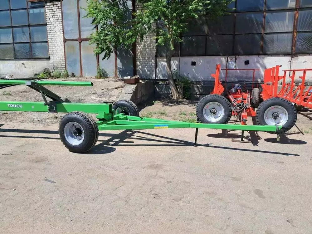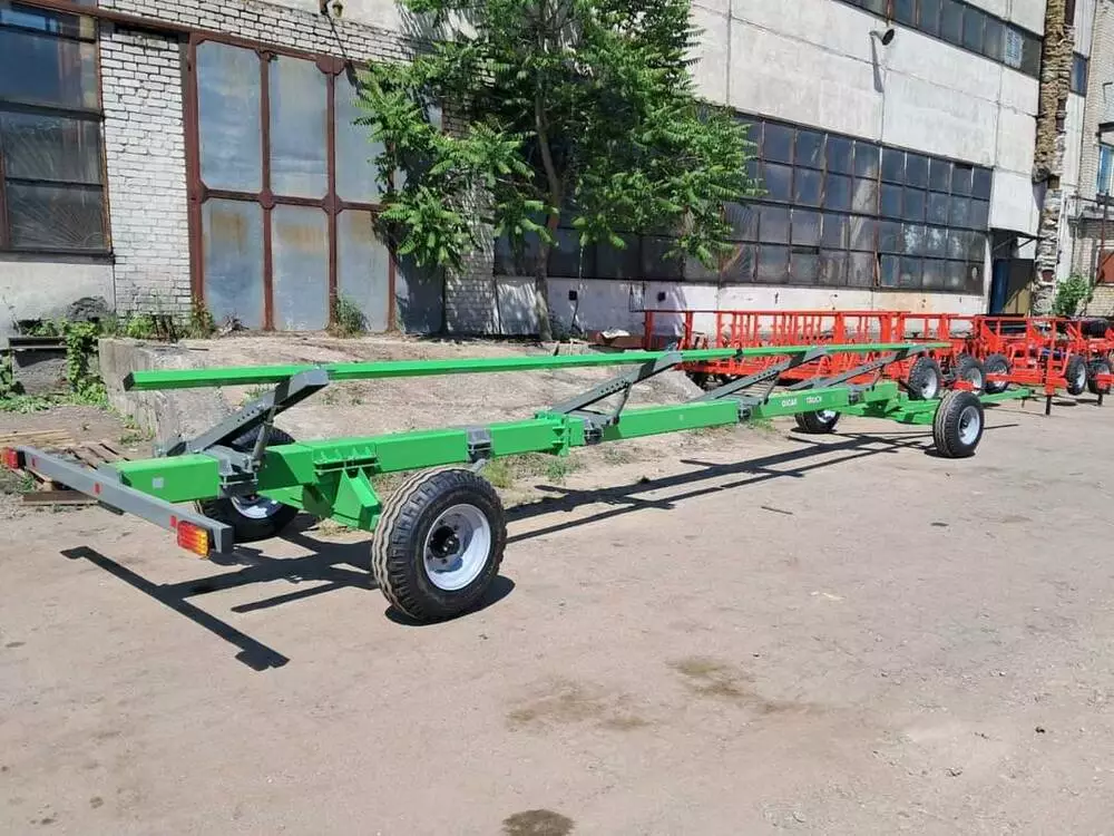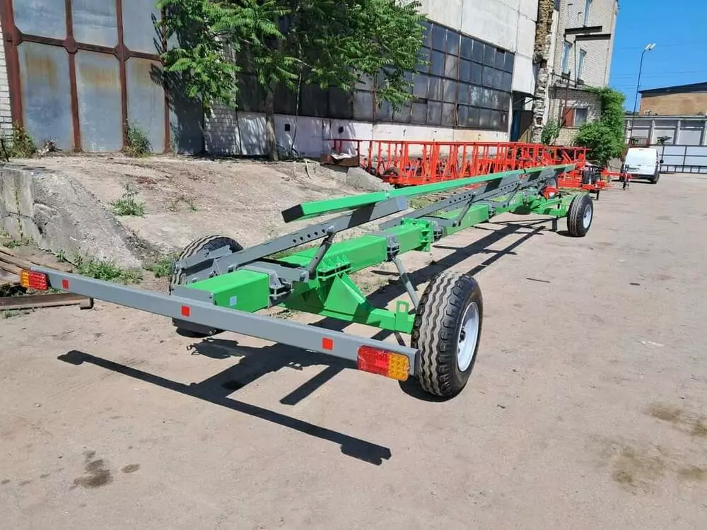 На даний агрегат можна встановити як зернову так і кукурудзяну чи соняшникову жниварку різних виробників та різної довжини. Вантажопідйомність від 2 до 4т. Колеса 15,3. Підсилені ступиці. Лед. освітлення. Чотири адаптера для найкращого підтримання жниварки.встановлені упори для унеможливлювання впирання передніх коліс в раму, при поворотах. Встановлена регульована підніжка для можливості під'єднання візка до комбайна однією людиною. Порошкова фарба. Передбачена можливість легкої та дешевої зміни довжини візка.