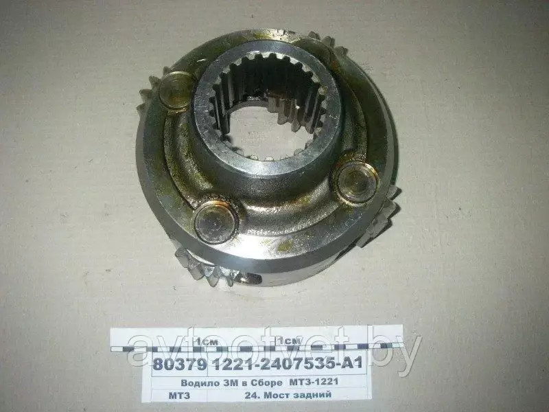 Водило заднего моста в сборе (с сателлитами) устанавливается на тракторах МТЗ-1221, 1523, оригинальное, производства ОАО 'Минский тракторный завод', ОАО 'МТЗ', г. Минск, Республика Беларусь Планетарная передача (ПП) — механическая передача вращательного движения, за счёт своей конструкции способная в пределах одной геометрической оси вращения изменять, складывать и раскладывать подводимые угловые скорости и/или крутящий момент. Обычно является элементом трансмиссии различных технологических и транспортных машин. Конструктивно ПП всегда представляет собой набор взаимозацепленных зубчатых колёс (не менее 4), часть из которых (не менее 2) имеет общую геометрическую неподвижную ось вращения, а другая часть (также, не менее 2) имеет подвижные оси вращения, концентрически вращающиеся на так называемом «водиле» вокруг неподвижной. Зубчатые колёса на неподвижной оси всегда связаны друг с другом не напрямую, а через зубчатые колёса на подвижных осях, а ввиду того, что вторые способны не только вращаться относительно первых, но и обкатывать их, тем самым передавая поступательное движение на водило, все звенья ПП, на которые можно подавать/снимать мощность, получают возможность вращаться дифференциально, с тем лишь условием, что угловая скорость любого такого звена не абсолютно хаотична, а определяется угловыми скоростями всех остальных звеньев. В этом плане ПП похожа на планетарную систему, в которой скорость каждой планеты определяется скоростями всех остальных планет системы. Дифференциальный принцип вращения всей системы, а также то, что в своём каноническом виде набор зубчатых колёс, составляющих ПП, собран в некоем подобии солнца и эпициклически движущихся по орбите планет, даёт данной механической передаче такие присущие только ей интернациональные определения, как планетарная, дифференциальная (от лат. differentia — разность, различие) или эпициклическая, каждое из которых в данном случае есть синонимы. С точки зрения теоретической механики планетарная передача — это механическая система с двумя и более степенями свободы. Эта особенность, являющаяся прямым следствием конструкции, есть важное отличие ПП от каких-либо других передач вращательного движения, всегда имеющих только одну степень свободы. И эта особенность наделяет саму ПП тем важным качеством, что в аспекте воздействия на угловые скорости вращения ПП может не только редуцировать эти скорости, но и складывать и раскладывать их, что, в свою очередь, делает её основным механическим исполнительным узлом не только различных планетарных редукторов, но таких устройств, как дифференциалы и суммирующие ПП.