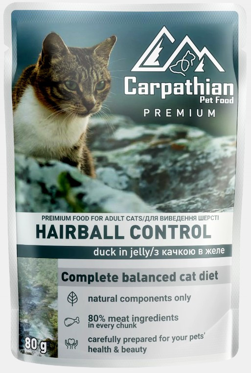 Вологий корм преміум класу від ТМ Carpathian Pet Food «Hairball Control» качка в желе (для виведення шерсті) в соусі для дорослих кішок безумовно забезпечить нормальну життєдіяльність Вашого улюбленця.