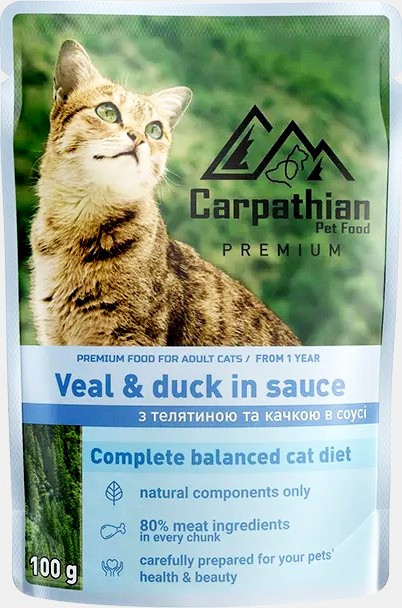 Вологий корм преміум класу від ТМ Carpathian Pet Food «Veal & duck in sauсe» з телятиною та качкою в соусі для дорослих кішок безумовно забезпечить нормальну життєдіяльність Вашого улюбленця.