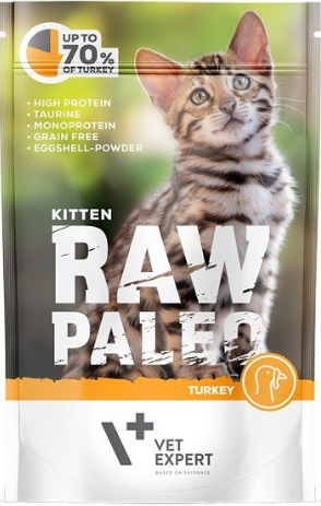 Вологий корм Vet Expert Raw Paleo Kitten Turkey, з індичкою – повнорационный корм для кошенят від моменту відлучення до 1 року. Формула корму беззернова та монобілкова, а це означає, що єдиним джерелом тваринного білка є легкозасвоювана індичка. Таурін позитивно впливає на роботу серця, а подрібнена яєчна шкаралупа є джерелом кальцію. Високий вміст свіжого м'яса гарантує високі смакові якості.