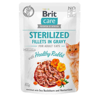 Вологий корм для стерилізованих котів Brit Care Cat Fillets In Gravy pouch філе кролика в соусі - беззерновий вологий корм у вигляді апетитних шматочків із м'яса кролика та курячого філе з обліпихою та настурцією в натуральному соусі для стерилізованих котів.