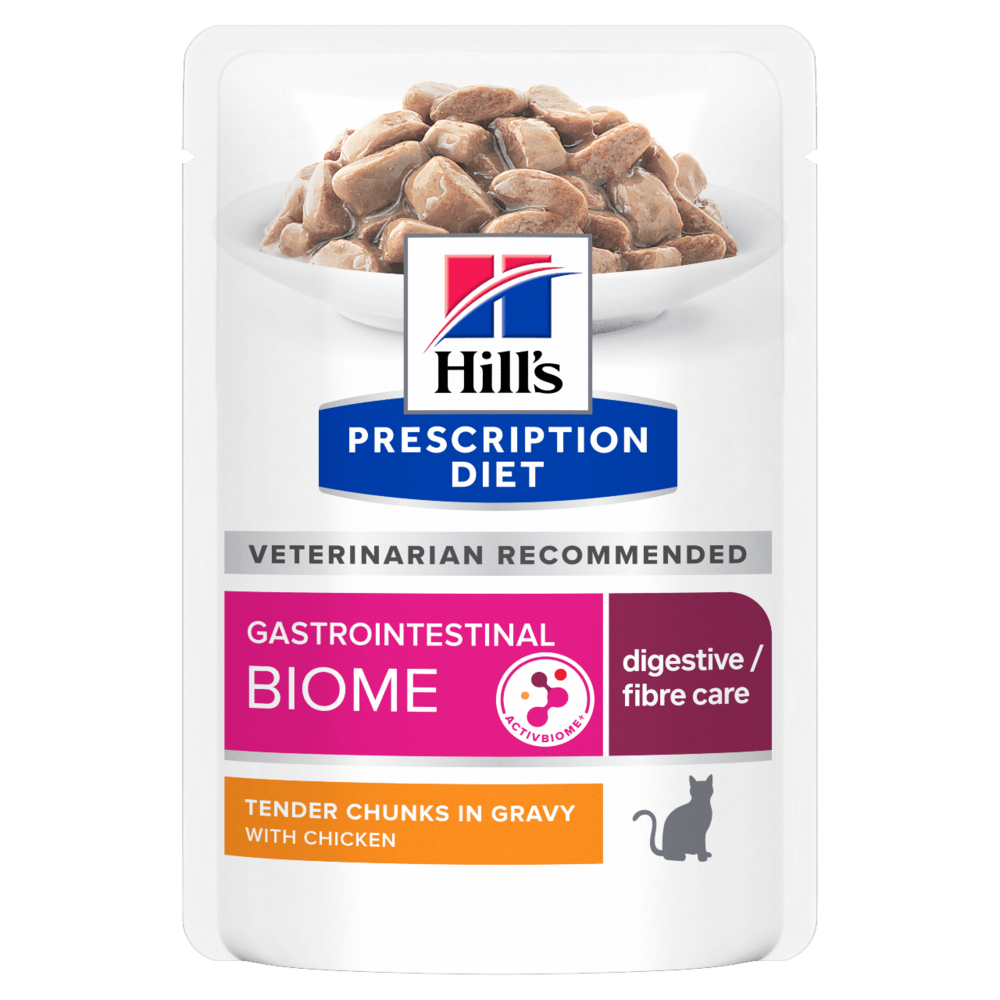 Вологий корм для котів Hill’s PRESCRIPTION DIET Gastrointestinal Biome, з куркою – повнораціонне дієтичне харчування, спеціально розроблене дієтологами та ветеринарними лікарями для покращення травлення, якості й регулярності випорожнень і запобігання рецидивів шлунково-кишкових розладів.