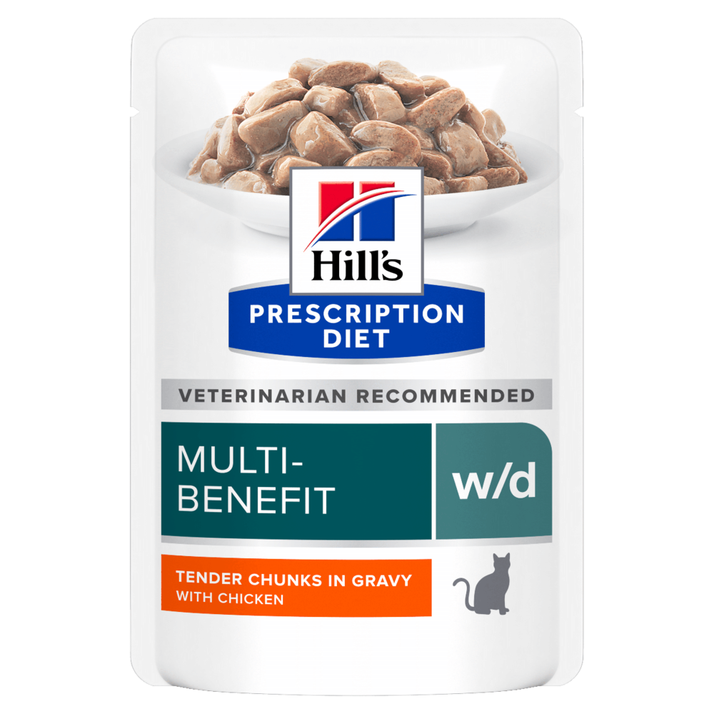 Вологий корм для котів Hill’s PRESCRIPTION DIET w/d, з куркою – повнораціонне дієтичне харчування, спеціально розроблене дієтологами та ветеринарними лікарями для стабілізації рівня глюкози у крові, підтримання роботи ШКТ завдяки додаванню до раціону клітковини, підтримання оптимальної ваги та підтримки здоров’я сечовидільної системи.