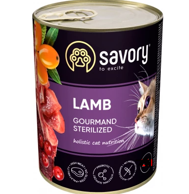 Savory Cat Sterilised Lamb pate - ніжний паштет із соковитою та рихлою текстурою зберігає концепцію повноцінного холістичного раціону. Можна використовувати як самостійне харчування, або у комбінації ії сухим кормом у різні прийоми їжі. Чудово компенсує нестачу питної води у раціоні, підтримує здорове травлення. Більш калорійний варіант паштету для дорослих стерилізованих котів та кішок.