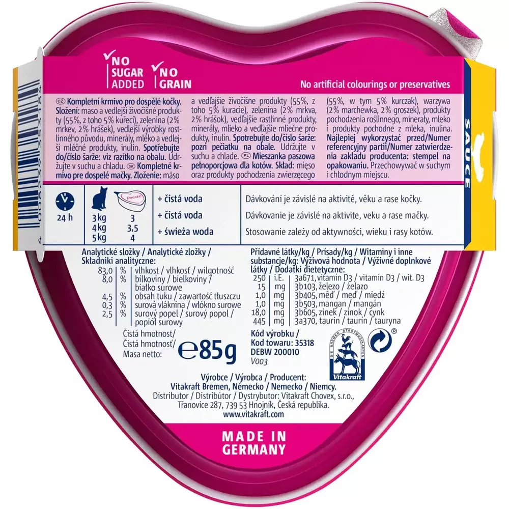 Повнораціонний вологий корм високої якості, у формі серденька. Узгоджений з харчовими потребами дорослих котів. Має неперевершений смак, завдяки шматочкам інгредієнтів, що легко розпізнати, та апетитному соусу. Без цукру, без консервантів та барвників.