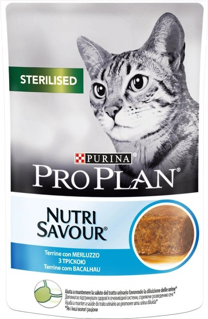 Корм вологий для дорослих стерилізованих кішок Purina Pro Plan Sterilised Nutrisavour шматочки в паштеті з тріскою - це баланс смаку і користі для Вашої кішки. Розроблений спеціально з урахуванням потреб дорослих стерилізованих і кастрованих котів