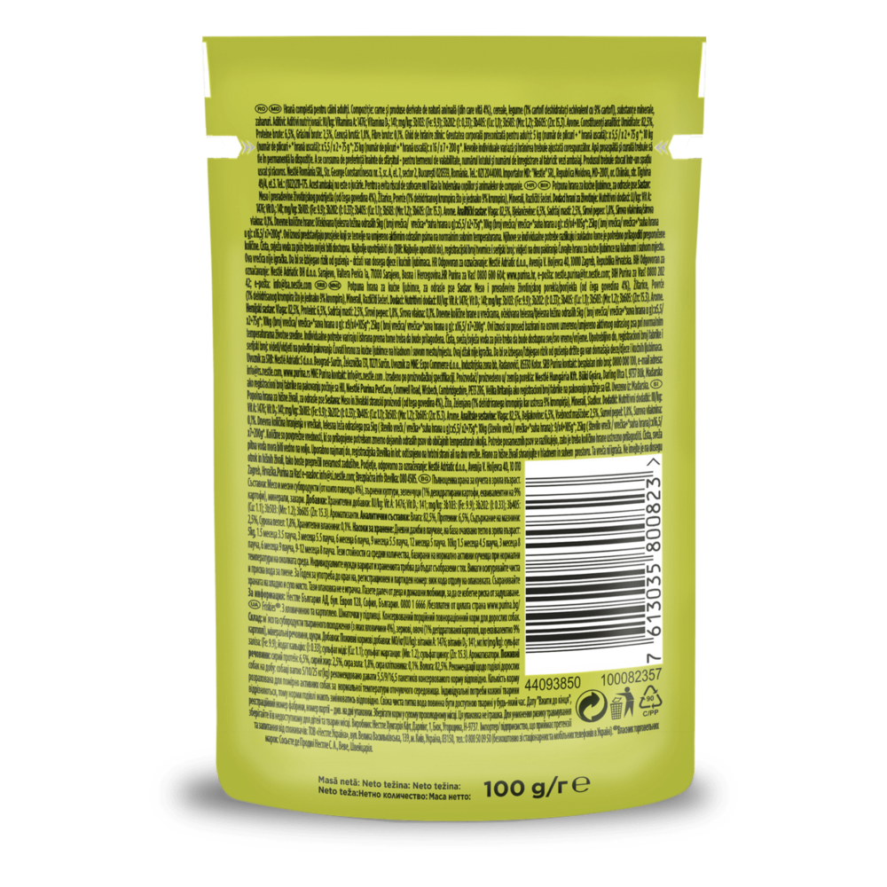 Для дорослих собак на добу: собаці вагою 5/10/25 кг(kg) рекомендовано давати 5.5/9/16.5 пакетиків консервованого корму відповідно. Кількість корму розрахована для помірно активних собак за нормальної температури оточуючого середовища. Індивідуальні потреби кожної тварини відрізняються, тому норми годівлі мають змінюватись відповідно. Свіжа чиста питна вода повинна бути доступною тварині у будь-який час.