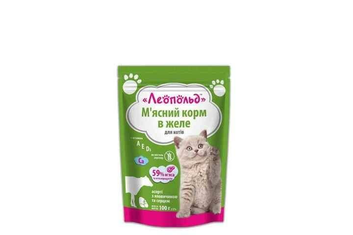 Вологий корм Леопольд для кішок асорті з яловичиною та серцем у желе 100 г