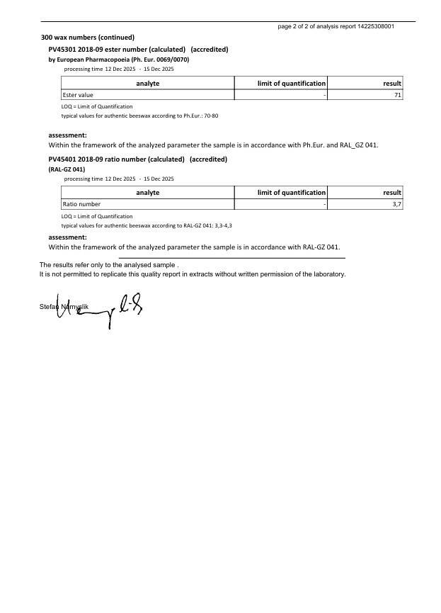 Воскосировина, яка використовується для виробництва вощини, проходить перевірку якості в німецькій сертифікованій лабораторії FOOD QS; протоколи досліджень є у вільному доступі. Активне посилання на результати перевірки конкретної партії воску нанесено у вигляді QR-коду на кожну упаковку.