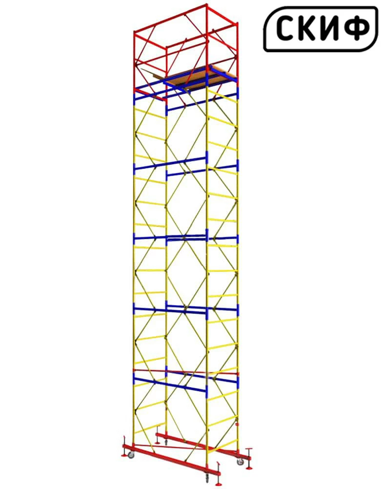 Узел крепления колес усовершенствован и выдерживает большие нагрузки. Стабилизаторы колес позволяют выровнять высоту и обеспечить устойчивость вышки