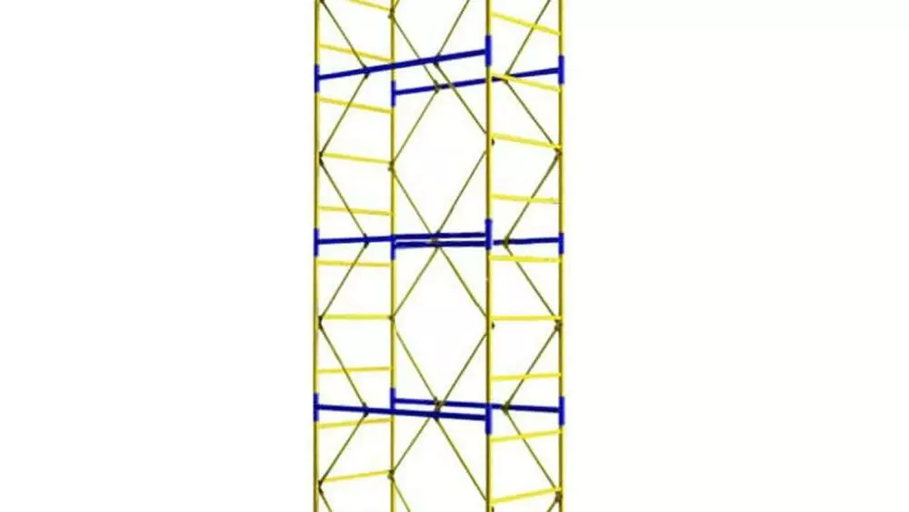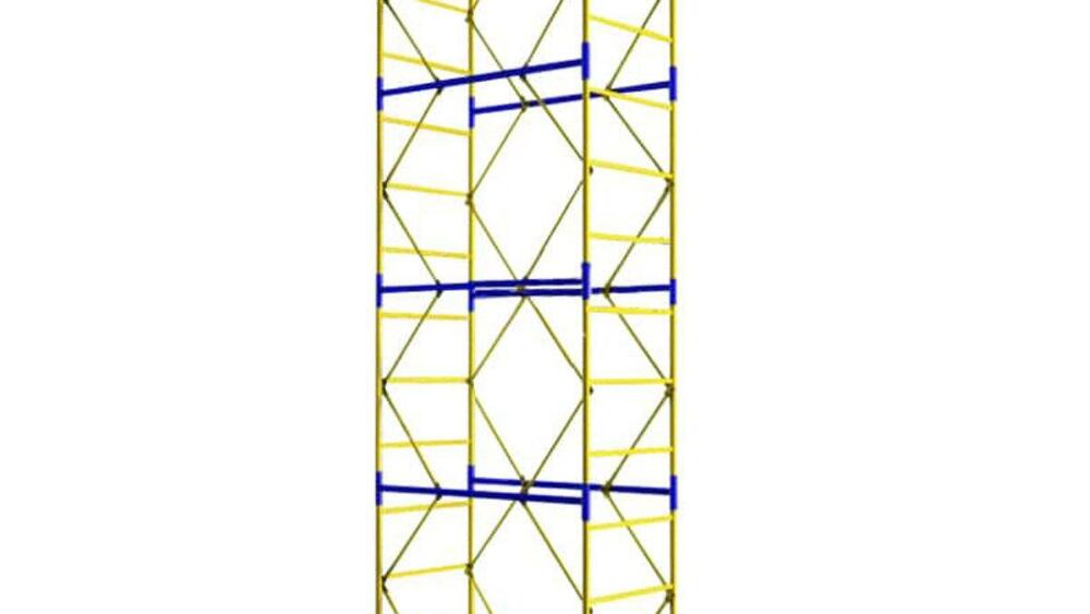 Вышка снабжена диагональными металлическими стяжками. Они обеспечивают дополнительную устойчивость при резких порывах ветра. Настил изготовлен из фанеры толщиной 5 мм и имеет люк для безопасного и удобного перемещения во время работ. Если докупить еще один настил, можно работать вдвоем: вышка выдерживает вес до 250 кг.