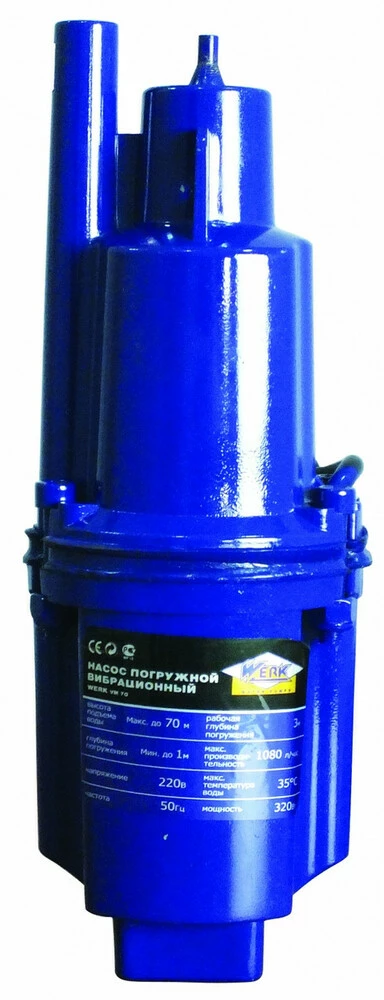 WERK VM70 Насос вибрационный Обращаем Ваше внимание! Принцип работы вибрационного насоса не позволяет ему работать на глубине более 3 м, так как столб воды будет продавливать мембрану резинового обратного клапана, что может привести к преждевременному выходу техники из строя.