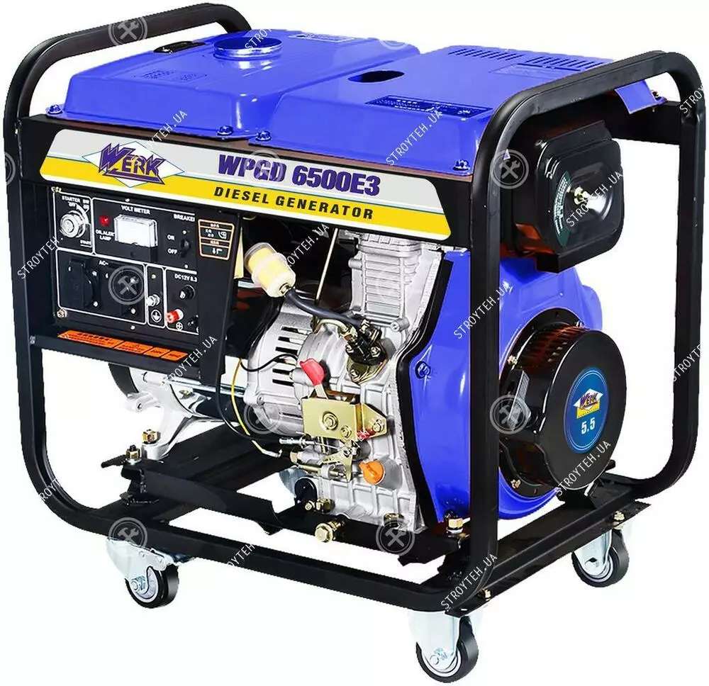 Werk WPGD6500E3 Электрогенератор Дизельная генераторная установка для организации автономного энергоснабжения частного дома, коттеджа, офиса, мастерской или небольшого предприятия. Он отлично справляется со своей задачей, как при длительной, так и при кратковременной нагрузке, вне зависимости от климатических условий. К главным особенностям можно смело отнести высокий уровень выносливости, большое время непрерывной работы и повышенный моторесурс. Все узлы электрогенератора смонтированы на открытой стальной раме с антивибрационным креплением. Такое удачное исполнение, позволяет использовать технику в самых разных условиях с большой интенсивностью эксплуатации. Четырехтактный дизельный двигатель