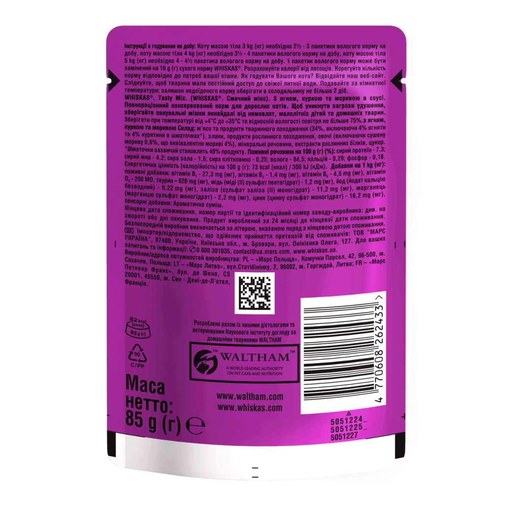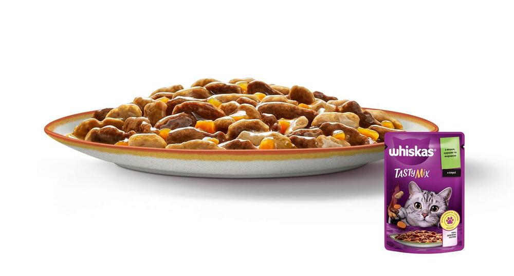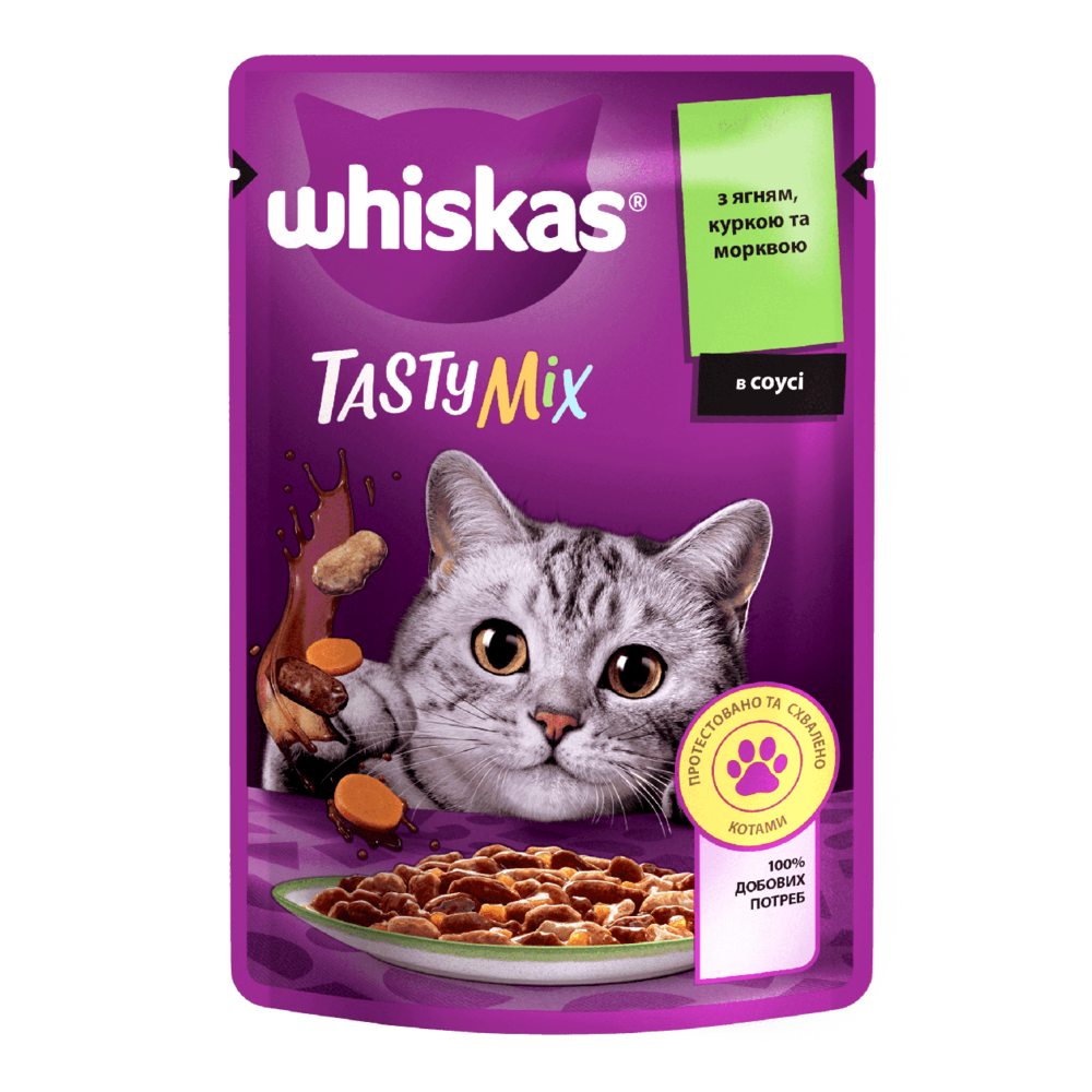 Чудові поєднання ягняти, курки і моркви в соусі - це те, про що мріє ваша кішка, в новій повній і збалансованій колекції блюд Whiskas Tasty Mix. Щоб зробити кожне блюдо особливим, кожен смак містить три основні інгредієнти: різні види риби, а також курку і овочі, змішані в смачній підливі.