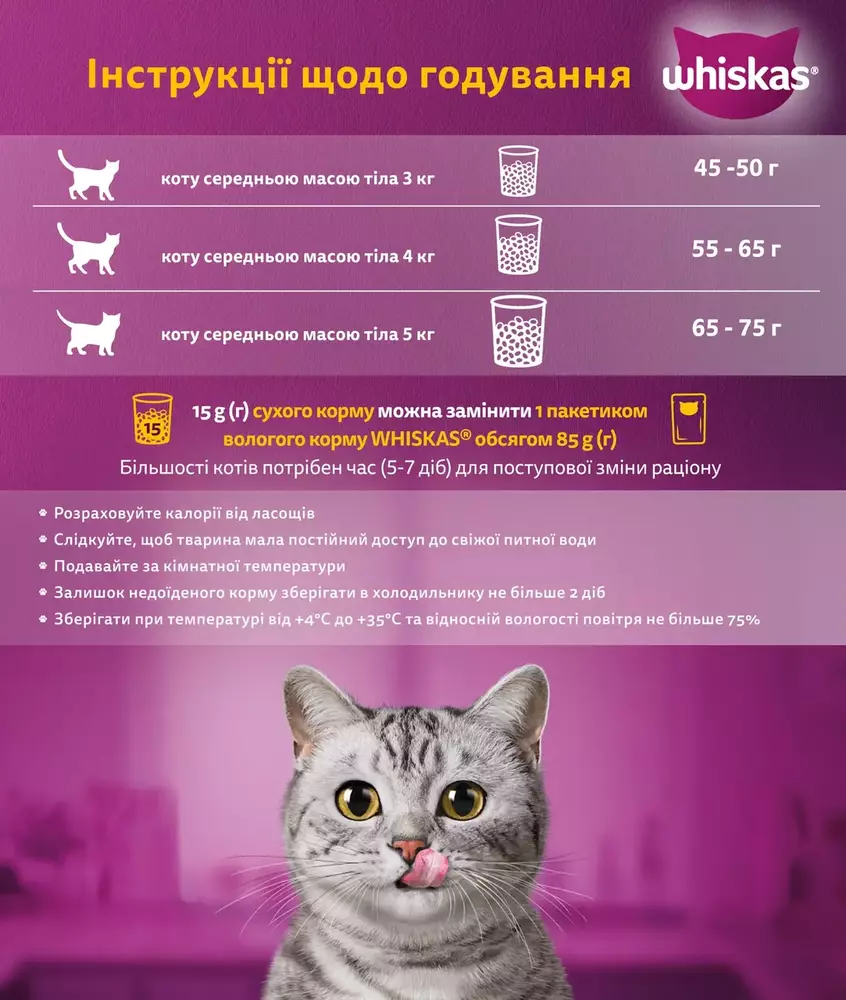 1 пакетик вологого корму може бути замінений на 16 g (г) сухого корму WHISKAS®. Більшості котів потрібен час (5-7 діб) для поступової зміни раціону.