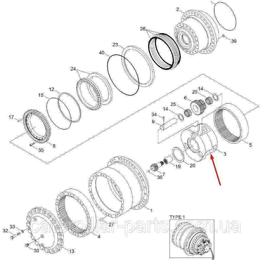 Планетарна передача (водило сателітів, сателіти, сателіт) бортового редуктора (редуктора ходу) HYUNDAI R140-7A