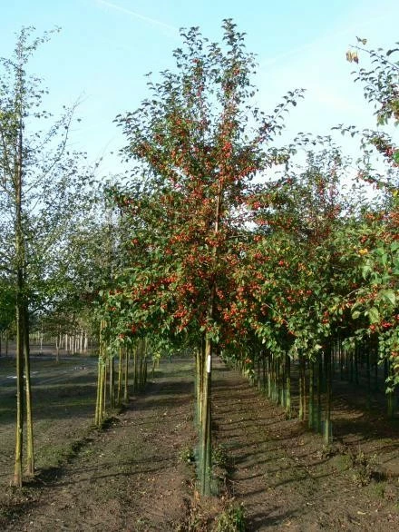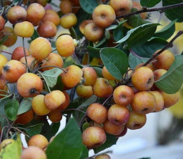 Плоди округлі або злегка сплюснуті, без чашок, 1,5-2,3 см. Завдовжки і 2,6 в діаметрі, оранжево-червоні, в червону смужку, тонка плодоніжка. Коренева система стрижневого типу до 1,5 м. Дуже толерантна до розміщення поруч інших рослин.