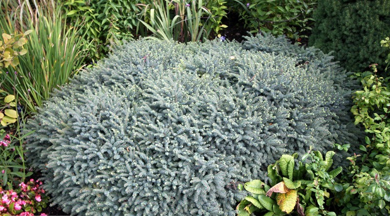 Хвоя: голчаста, дуже густа і тонка, коротка, довжиною не більше 1 см. Блакитно-зеленого кольору з сріблястим відтінком. Молодий приріст має дуже соковите зелене забарвлення і виділяється на тлі старої хвої.