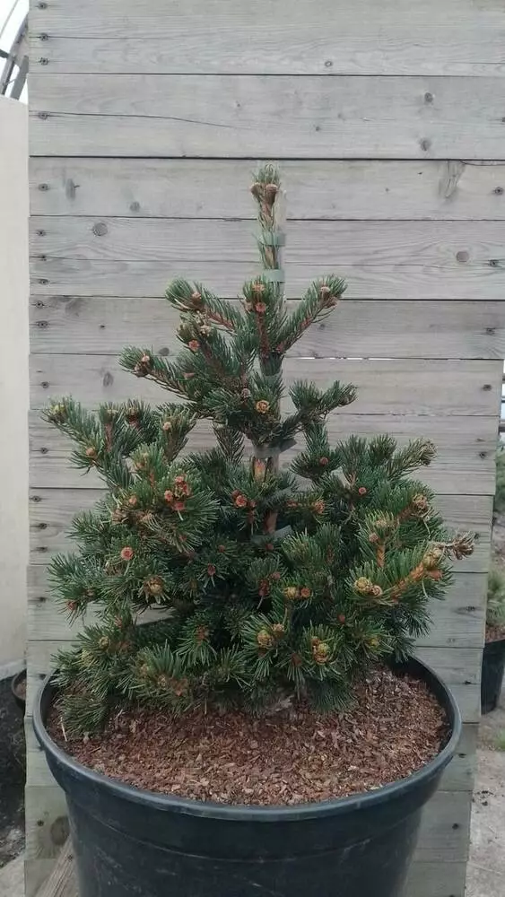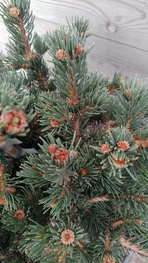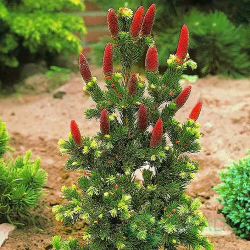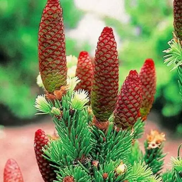 Має дуже ефектні великі шишки - спочатку лілово-червоні, потім набувають коричневого кольору.