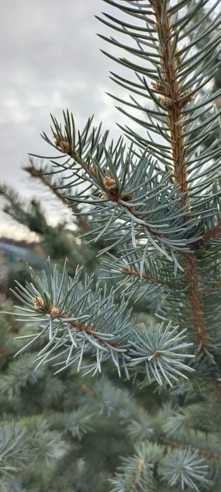 Хвоя жорстка, гострокінцева з сивуватим восковим нальотом від яскравого блакитного до сіро-зеленого.