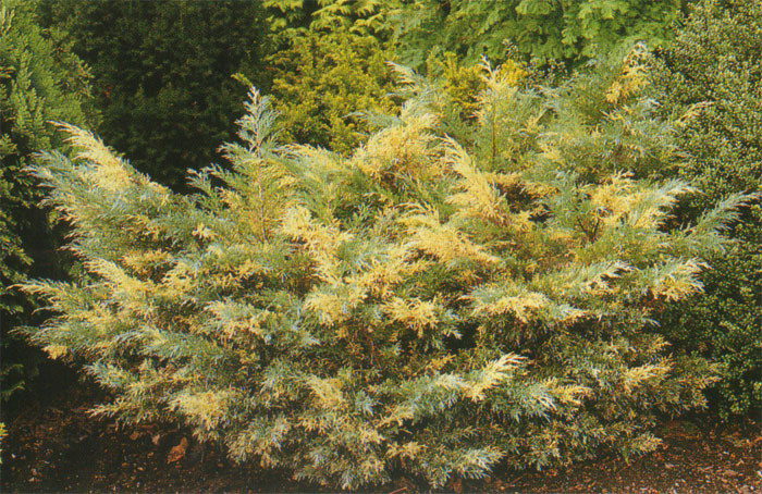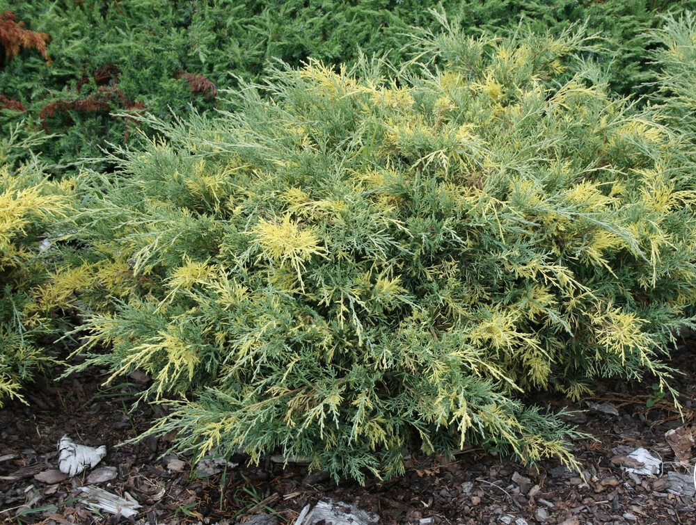 Опис. Декоративний круглий рік, оригінальний і привабливий чагарниковий сорт ялівцю з розлогою неправильною формою крони, синьо-зеленим забарвленням хвої і золотисто-жовтими великими вкрапленнями. Рослина невибаглива, посухостійка, морозостійка, світлолюбна, добре переносить міські умови. Має фітонцидні і бактерицидні властивості. Хвоя, шишки та інші частини рослини містять отруйні речовини.