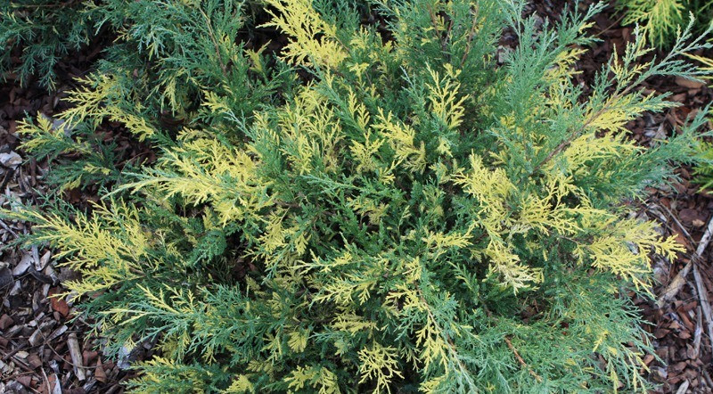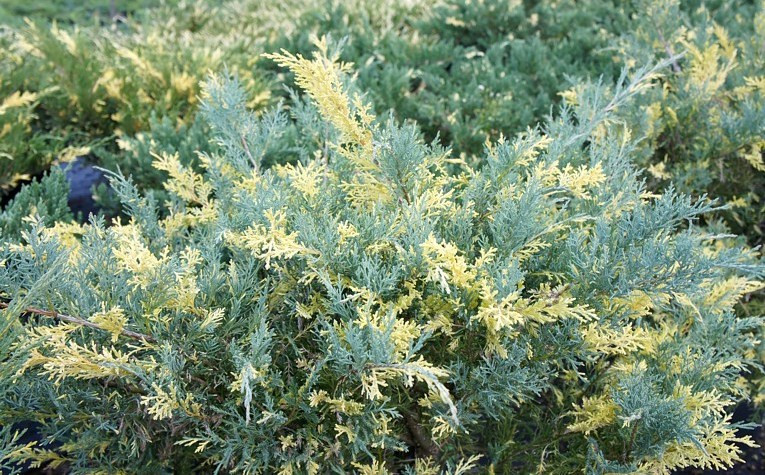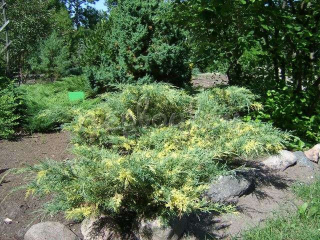 Опис. Декоративний круглий рік, оригінальний і привабливий чагарниковий сорт ялівцю з розлогою неправильною формою крони, синьо-зеленим забарвленням хвої і золотисто-жовтими великими вкрапленнями. Рослина невибаглива, посухостійка, морозостійка, світлолюбна, добре переносить міські умови. Має фітонцидні і бактерицидні властивості. Хвоя, шишки та інші частини рослини містять отруйні речовини.