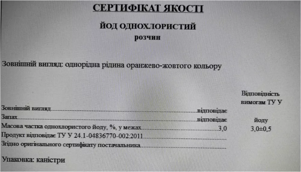 Йод однохлористий (монохлорид іода) 3% — являє собою рідину жовтогарячо-жовтого кольору. Має різкий запах.