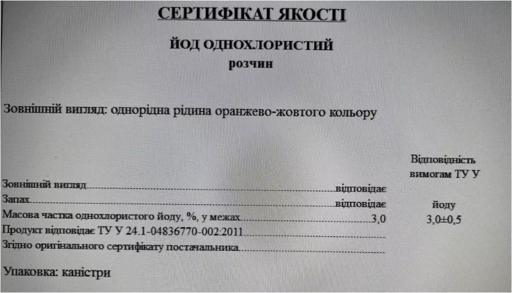 Йод однохлористий (монохлорид іода) 3% — являє собою рідину жовтогарячо-жовтого кольору. Має різкий запах.