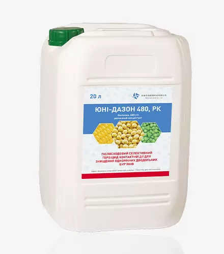 Назва товару: Юні-Дазон 480 Короткий опис: Юні-Дазон 480 — післясходовий контактний гербіцид широкого спектра дії для боротьби з однорічними дводольними бур'янами в посівах сільськогосподарських культур. Механізм дії: Містить дієву речовину бентазон, яка контактно проникає в рослини та блокує фотосинтетичний транспорт електронів у хлоропластах. Це призводить до порушення процесів поділу та росту клітин, припинення фотосинтезу і загибелі бур'янів. Переваги: - Широкий спектр контрольованих дводольних бур’янів. - Можливе використання самостійно та в бакових сумішах. - Добре розчиняється у воді. - Не фітотоксичний для оброблюваних культур. Особливості застосування: - Обприскування у фазі 2-4 листків у бур’янів. - Не проводити обробку перед дощем чи поливом. - Видима дія через 1-7 днів, повна загибель через 10-14 днів. - Обробка за температури повітря +10...+25°C. - Максимальна кратність обробок — 2.