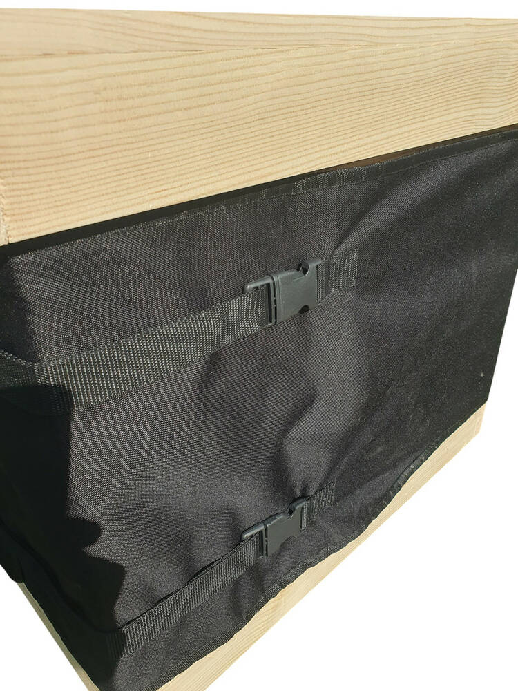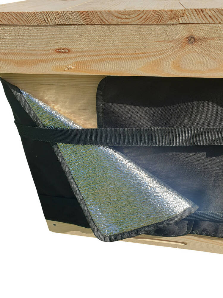 Зовнішній бік чохла для вулика, тканина «Оксфорд» (водовідштовхувальна зносостійка), внутрішня сторона – фольгоізол (відбиває теплове випромінювання, знижуючи теплові втрати). З зовнішнього боку розмішані ремені для регулювання довжини та закріплення на бджолиному вулику.