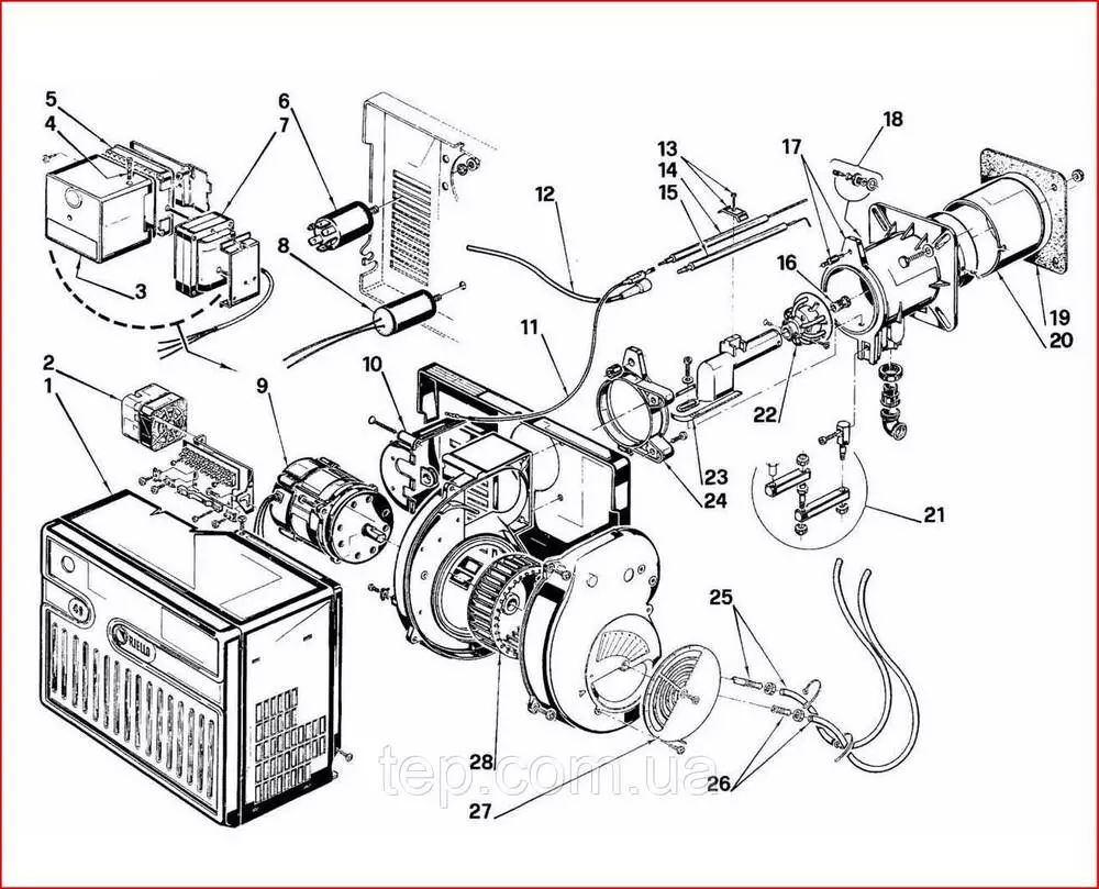 -        не закрывающаяся во время остановки горелки воздушная заслонка (позволяет воздуху из вне поступать в камеру сгорания и не допускать перегрева различных элементов горелки теплотой из камеры сгорания печи или генератора теплого воздуха;