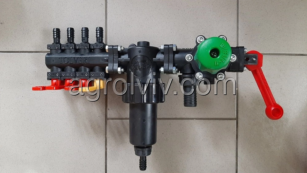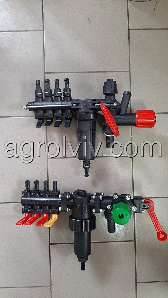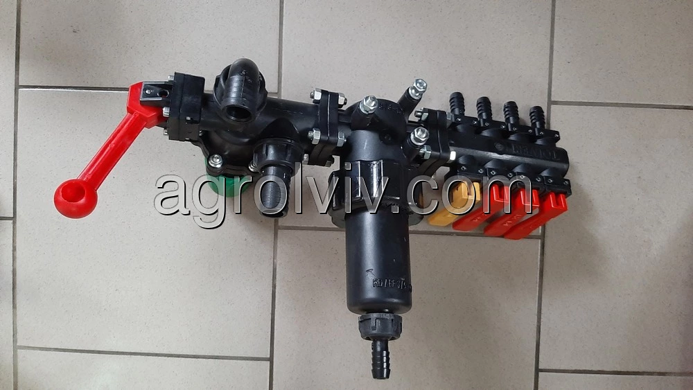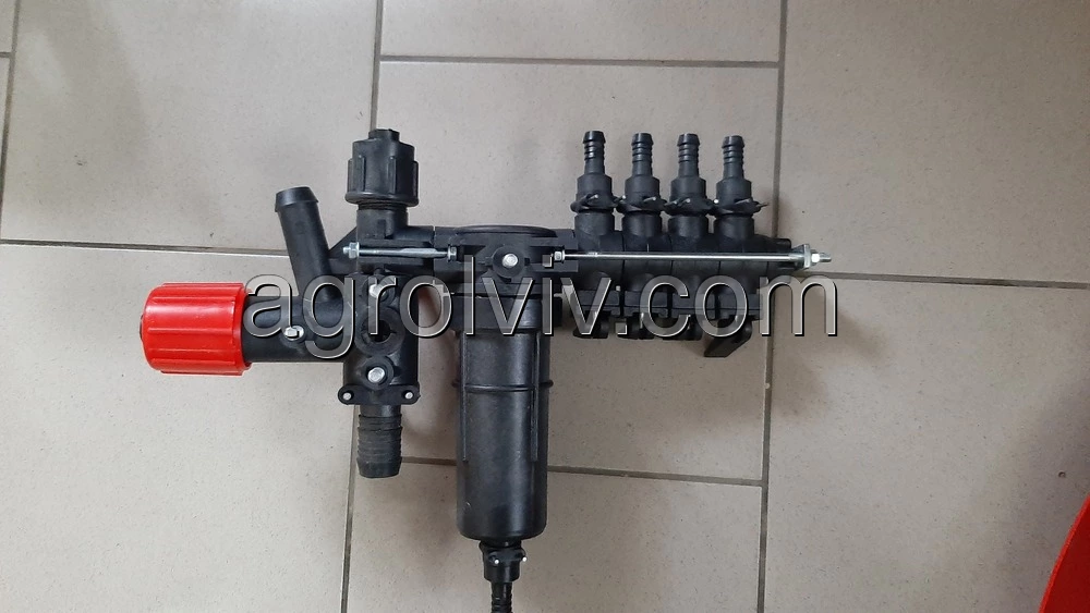 Розподільник для оприскувача або регулятор тиску. Це одна з найголовніших частин оприскувача після насоса. За допомогою розподільника відбувається подача рідини під тиском на штангу оприскувача до форсунок які розпилюють різні хімічні сполуки. З допомогою регулятора можна відрегулювати необхідний тиск який потрібний для оброблення хімікатами тих чи інших культур. Встановлений тиск можна побачити на манометрі. Розподільник оприскувача також поділений на три чотири або більше секцій, які можуть працювати одночасно або перекриватися в залежності від робочих потреб, що дає можливість обробляти ту частину поля яку необхідну. Подачу рідини під тиском до розподільника забезпечує насос оприскувача.