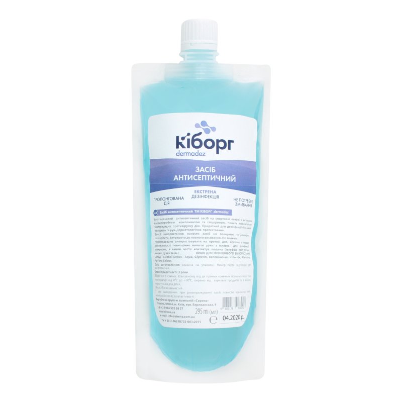 Засіб антисептичний ТМ Кіборг DERMADEZ (дойпак), 295мл. Антисептик ТМ Кіборг DERMADEZ - готовий до використання спиртовий розчин для дезінфекції шкіри рук шляхом оприскування чи протирання. DERMADEZ завдяки діючим компонентам придатний для проблемної шкіри, містить високоякісні компоненти, що зволожують шкіру та захищають її ліпідний шар. DERMADEZ сумісний з усіма миючими засобами, не містить альдегідів, фенолів, амонієвих сполук.Дезінфекція шкіри рук в медичній та стоматологічній практиці, перукарнях, масажних і косметологічних кабінетах, побуті і т.п. Багатоцільовий антисептичний засіб на спиртовій основі з активним протимікробним компонентом та гліцерином. Чинить моментальну бактерицидну , противірусну дію. Придатний для дезінфекції будь-яких поверхонь та рук. Дерматологічно протестовано.