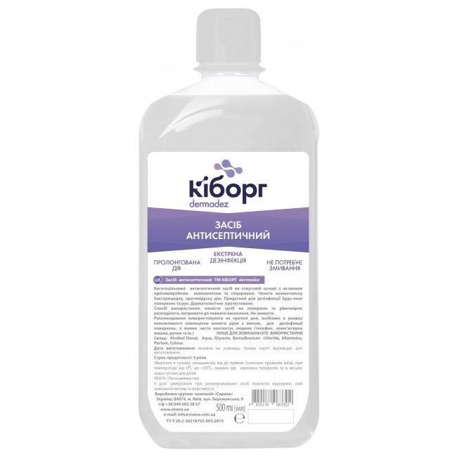 Засіб антисептичний ТМ Кіборг DERMADEZ (флакон+дозатор), 500мл. Антисептик ТМ Кіборг DERMADEZ - готовий до використання спиртовий розчин для дезінфекції шкіри рук шляхом оприскування чи протирання. DERMADEZ завдяки діючим компонентам придатний для проблемної шкіри, містить високоякісні компоненти, що зволожують шкіру та захищають її ліпідний шар. DERMADEZ сумісний з усіма миючими засобами, не містить альдегідів, фенолів, амонієвих сполук.Дезінфекція шкіри рук в медичній та стоматологічній практиці, перукарнях, масажних і косметологічних кабінетах, побуті і т.п. Багатоцільовий  антисептичний засіб на спиртовій основі з активним протимікробним  компонентом та гліцерином. Чинить моментальну бактерицидну , противірусну дію. Придатний для  дезінфекції будь-яких поверхонь та рук. Дерматологічно  протестовано.