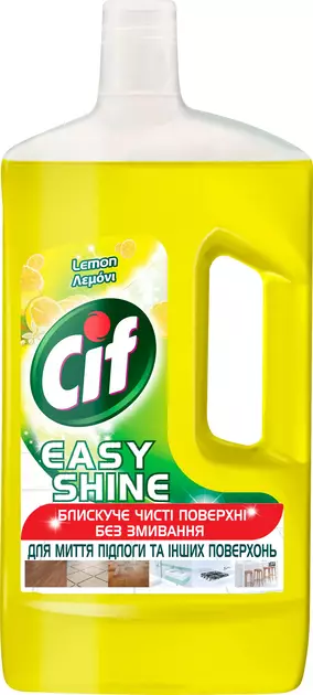 Засіб CIF для чищення підлоги та стін видаляє бруд, не ушкоджуючи поверхню, і повертає блиск і красу поверхням. Завдяки своїй формулі, легко видаляє навіть застарілий бруд, надає блиск і не вимагає змивання.