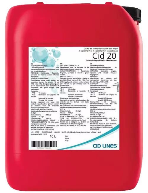 CID 20 - високоефективний дезінфікуючий засіб з полікомпонентною формулою, який має високу ступінь піноутворення. Підходити для короткострокового знезараження будь-яких видів поверхонь. Завдяки детально розробленій рецептурі засіб має потужний протидіючий ефект до будь-яких видів хвороботворних мікроорганізмів (бактерії, спори, грибки, віруси). CID 20 характеризується стабільністю в роботі, економічністю, безпекою у виробництві, не завдає шкоди оброблюваним поверхням. Робочий розчин має нейтральний pH, неагресивний, ефективний навіть при низьких концентраціях. Засіб не захисту викликання. Показаний до застосування проти ящуру, вірусу класичної чуми свиней.