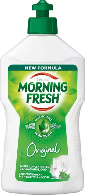 Morning Fresh – це концентрований бальзам для миття посуду. Ефективно видаляє жир та бруд і одночасно ніжний до шкіри рук. Має нейтральний рН, містить гліцерин і вітамін Е, які відомі з властивостей догляду за шкірою рук і нігтями.
