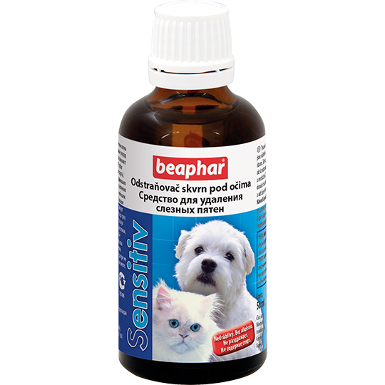 Засіб для видалення плям від сліз під очима собак та кішок Beaphar Sensitiv 50 мл. Поява темних, непривабливих плям під очима собак і кішок викликана сльозовиділенням і особливо ці плями помітні у тварин світлих забарвлень. Цей засіб допоможе вам ніжно та ефективно очистити шерсть навколо очей та видалити слізні плями.