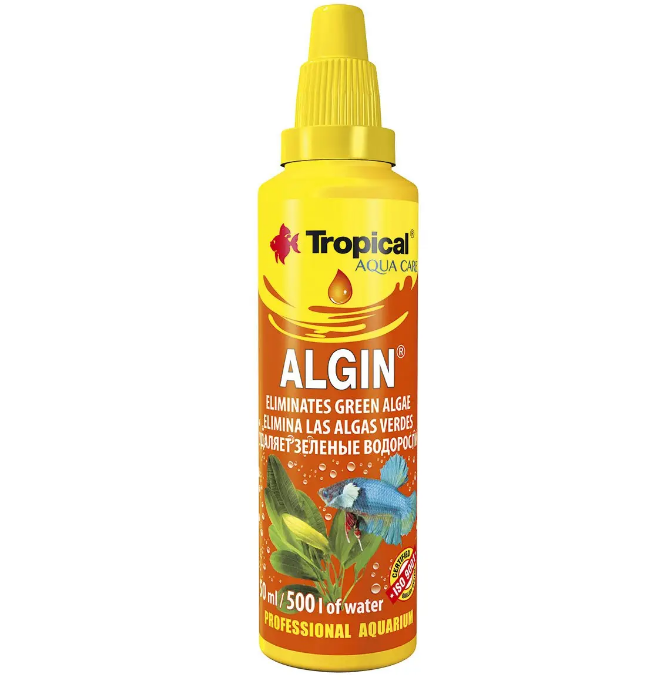 Tropical Algin - це препарат призначений для боротьби й обмеження розвитку зелених водоростей, які в умовах, що сприяють їхньому зростанню, можуть стати лихом, яке важко викорінити. Масовий розвиток водоростей істотно обмежує і гальмує розвиток вищих рослин, спричиняючи з часом їхнє відмирання. Тому боротьба з водоростями в акваріумі, хоча і складна, необхідна. Масовій появі зелених водоростей сприяють: підвищена жорсткість води, високий вміст азотних сполук, надмірне заселення акваріума і перегодовування риб.