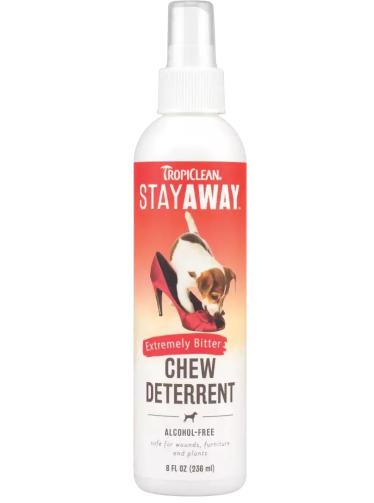 Засіб TropiClean Stay Away, для запобігання погризам 236 мл - це спрей, призначений для відлякування домашніх тварин від погризання меблів, рослин та інших предметів. Засіб містить натуральні гострі екстракти, які мають неприємний смак для тварин. При попаданні на слизові оболонки або язик тварини екстракти викликають печіння та подразнення. Це змушує тварину уникати оброблених поверхонь. Засіб безпечний для використання в будинку, оскільки не містить токсичних речовин. Воно підходить для собак, кішок, гризунів та птахів.