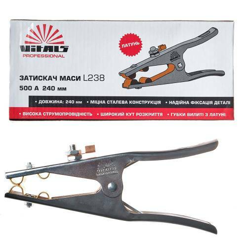 Затискач маси Vitals Profi L238 500A (латунь) — це необхідний аксесуар для проведення зварювальних робіт. Основна функція затискача — надійне з’єднання джерела живлення та деталі, що зварюється завдяки міцній конструкції в поєднанні з потужною пружиною.