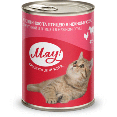 Збалансований консервований корм Мяу! для дорослих котів "З телятиною і птицею в ніжному соусі", 415 г